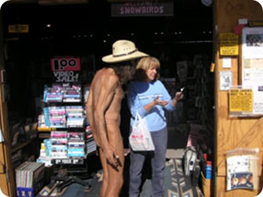 We stopped at the famous bookstore, Reader’s Oasis Bookstore. Very quirky store run by the famous "Naked Bookseller of Quartzite." Great selection of unusual books, both used and new. Paul is the owner of the Readers Oasis Bookstore. He has been in town many years. He is also a nudist. A visit to Quartzsite, AZ is incomplete if you have not visited Paul's bookstore. He walks around with his bare butt and a lot of other skin exposed to the sun and his customers. He only wears three socks….two on his feet and one….you figure it out. He loves to pose for pictures. We put two below but will not post the one he posed with Marsha.
