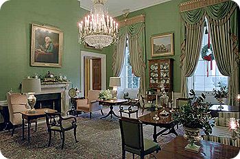 Next is the Green Room, which once served as Thomas Jefferson's dining room, is now furnished as a parlor and used for receptions. Most of the furniture was made in New York by Duncan Phyfe in 1810. The walls are covered with watered green silk with draperies of striped silk damask.