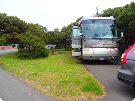 We are at Nehalem Bay State Park in Nehalem Bay. We had a little trouble upon arriving. Our original reserved site was F-01. It was impossible for Paul to get into site F-01, or for that matter get down the road to the site. He scraped the roof on almost every tree in that part of the park.
